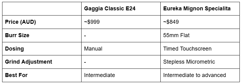 The Eureka Mignon range is also specifically designed for home espresso use, making it an ideal match for the Gaggia Classic lineup.